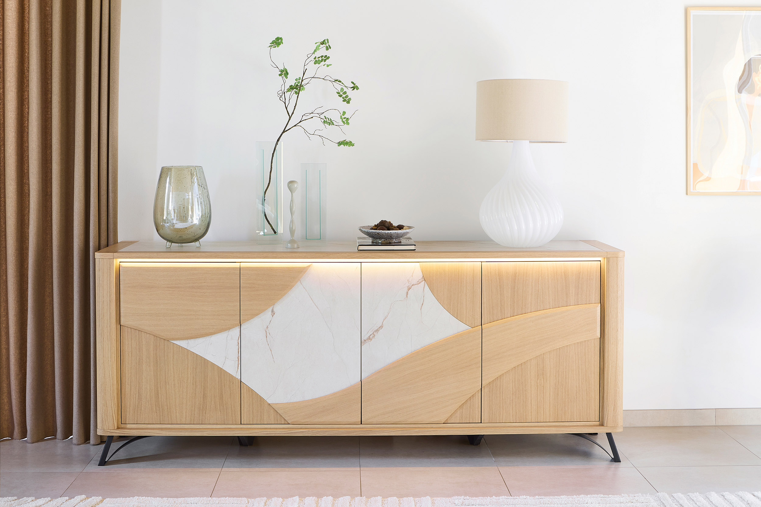 La collection Riviera marie avec élégance la chaleur du bois et la modernité de la céramique, disponible en finition beige veiné ou brun panaché. Un design raffiné qui apporte caractère et douceur à votre intérieur.
